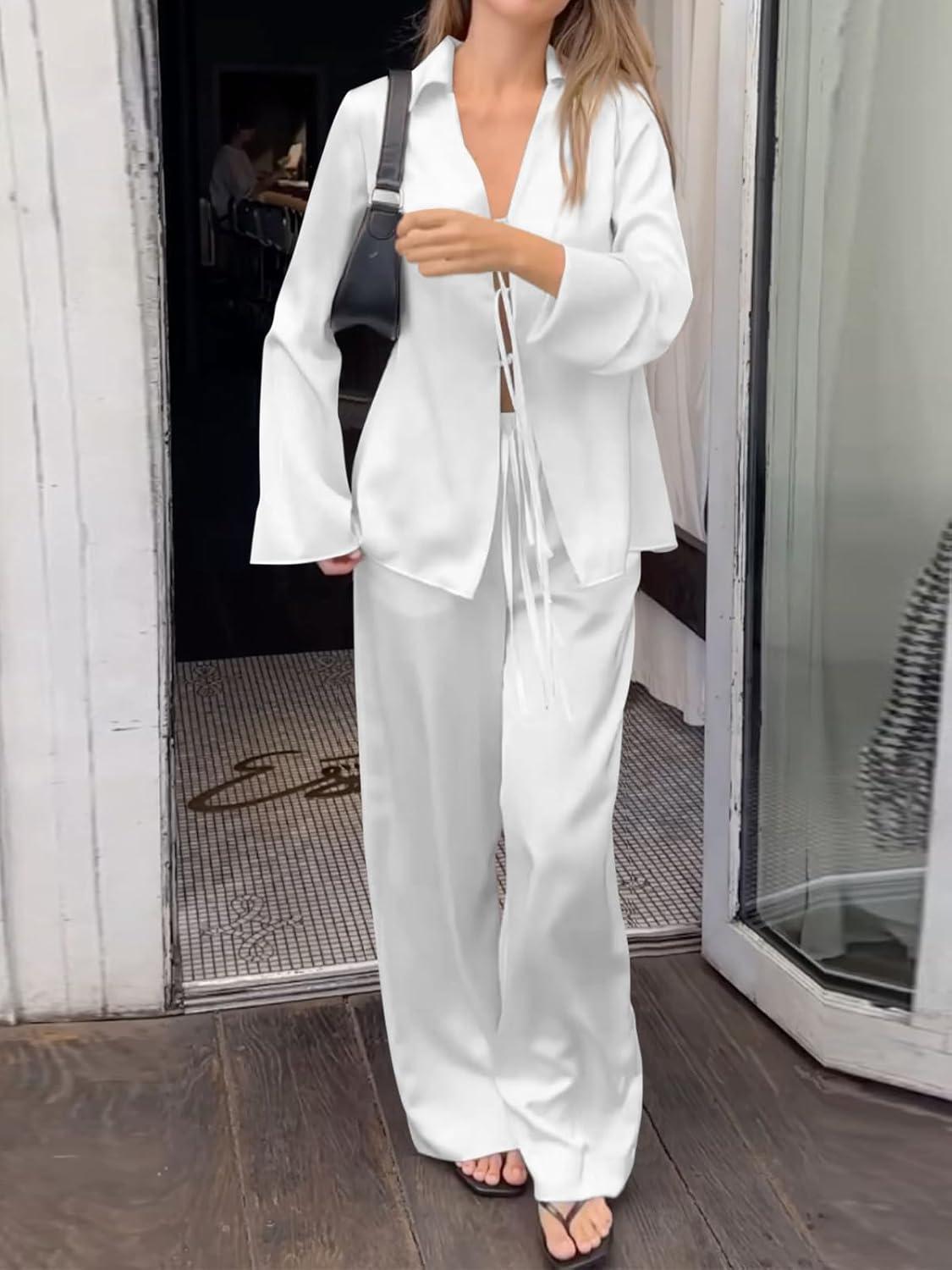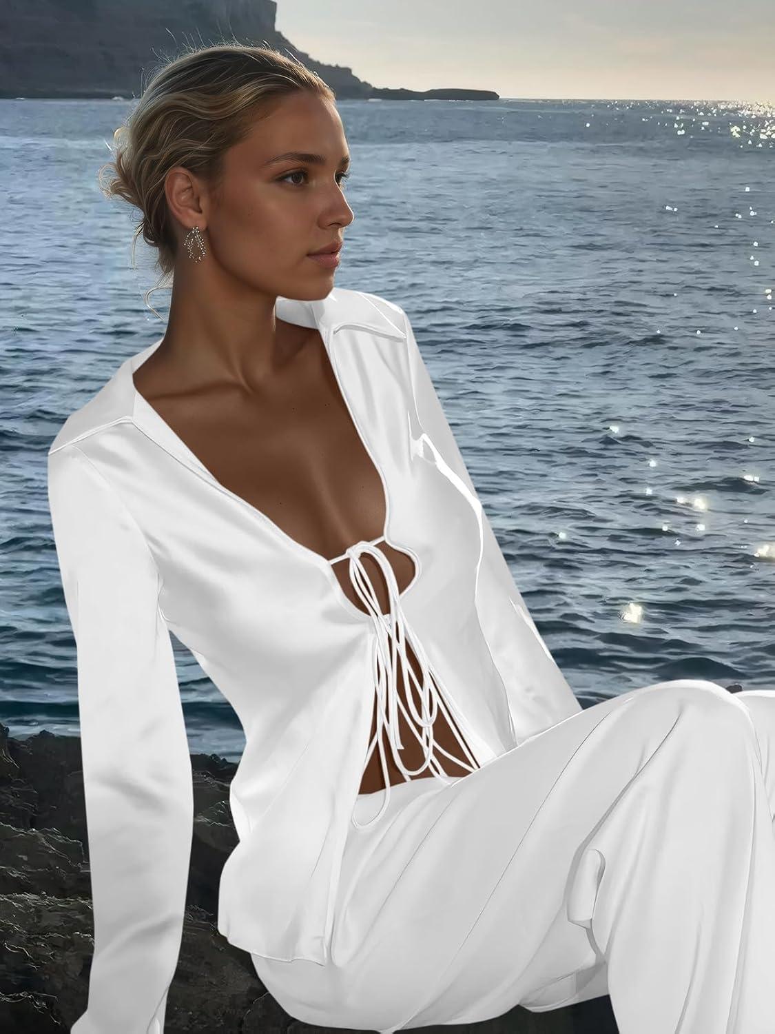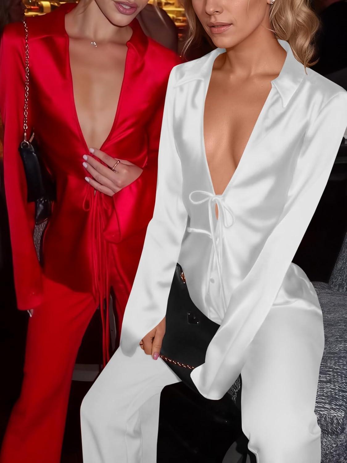 Womens Sexy Silk Satin 2 Piece Outfits Tie Front Long Sleeve Shirts and Pants Lounge Pajamas Sets Going Out Matching Set(White)