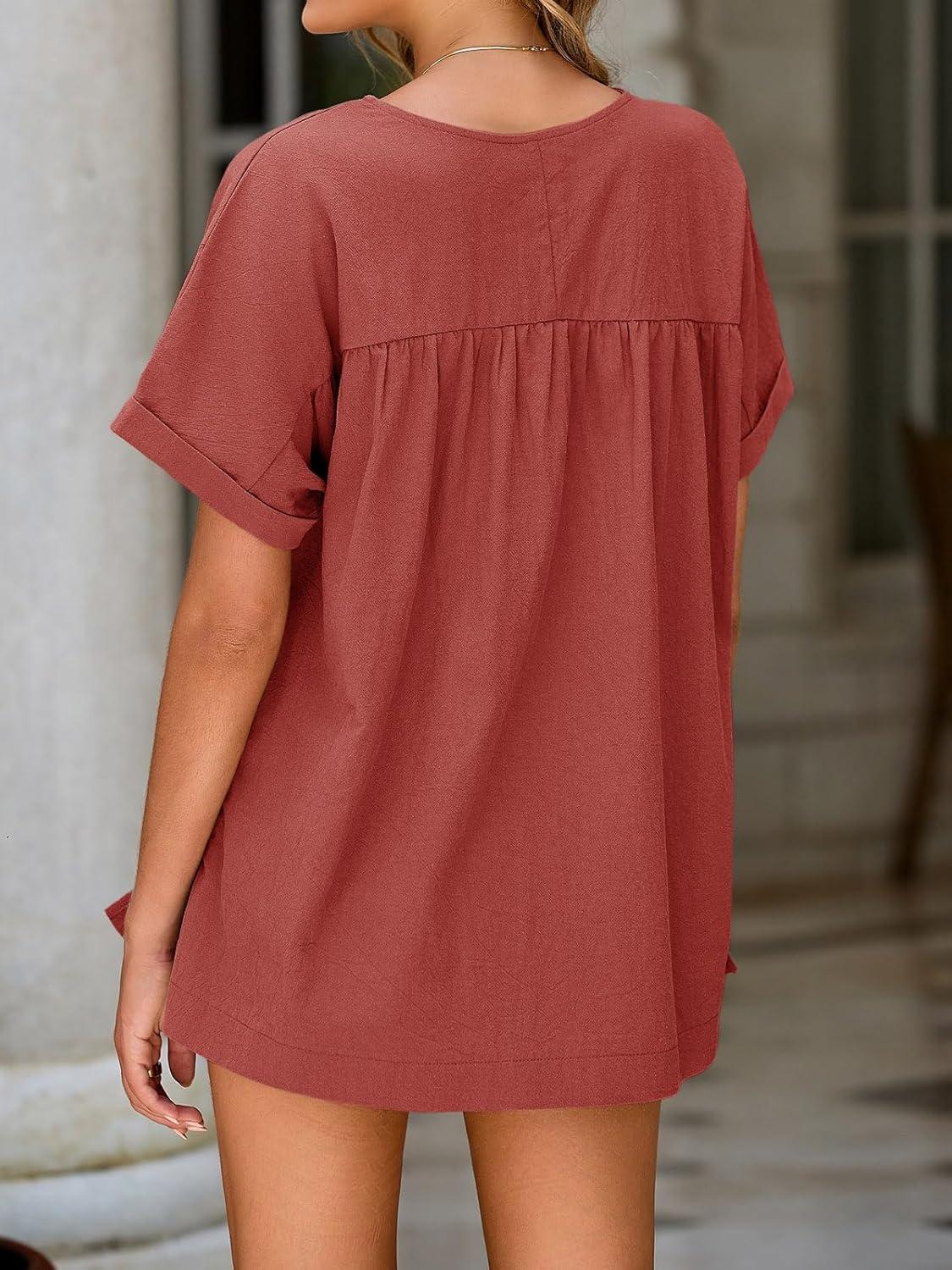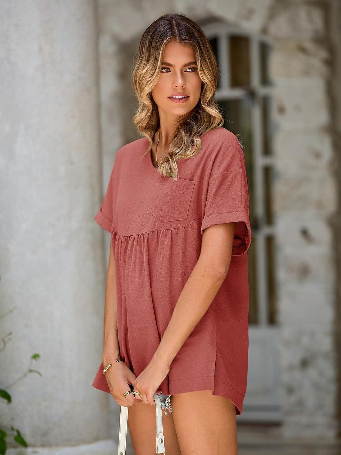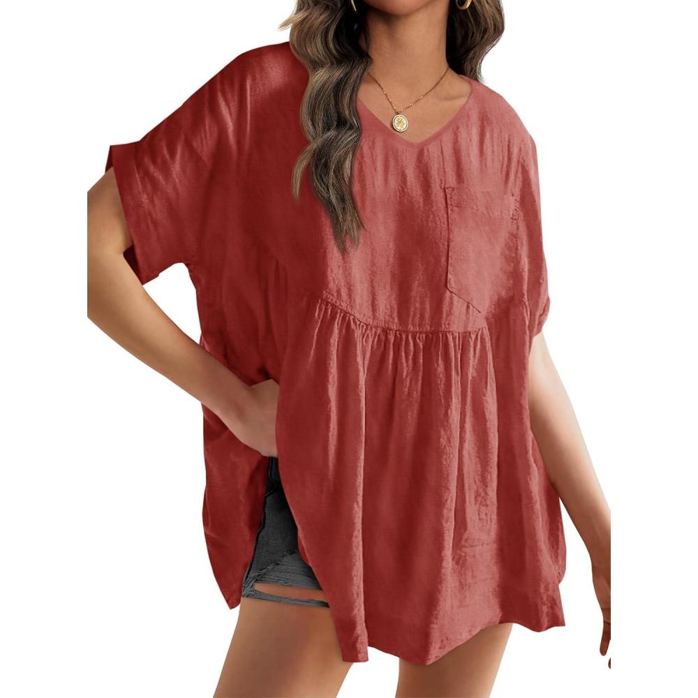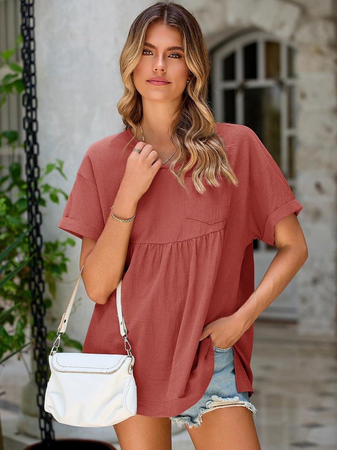 Womens V Neck Babydoll Tops Summer Short Sleeve Oversized Tshirts Casual Loose Fit Peplum Tunic Shirts(Orange Red)