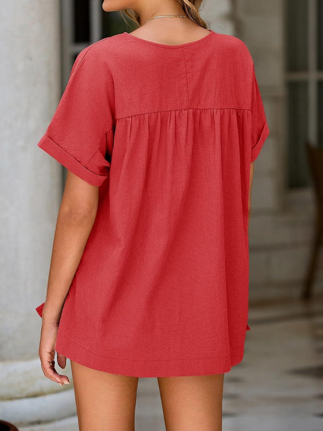 Womens V Neck Babydoll Tops Summer Short Sleeve Oversized Tshirts Casual Loose Fit Peplum Tunic Shirts(Red)